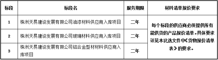 1.5采購(gòu)項(xiàng)目?jī)?nèi)容:為株洲天易建設(shè)發(fā)展有限公司物資供應(yīng)商入庫(kù)等,具體詳見比選文件第三“采購(gòu)需求”。